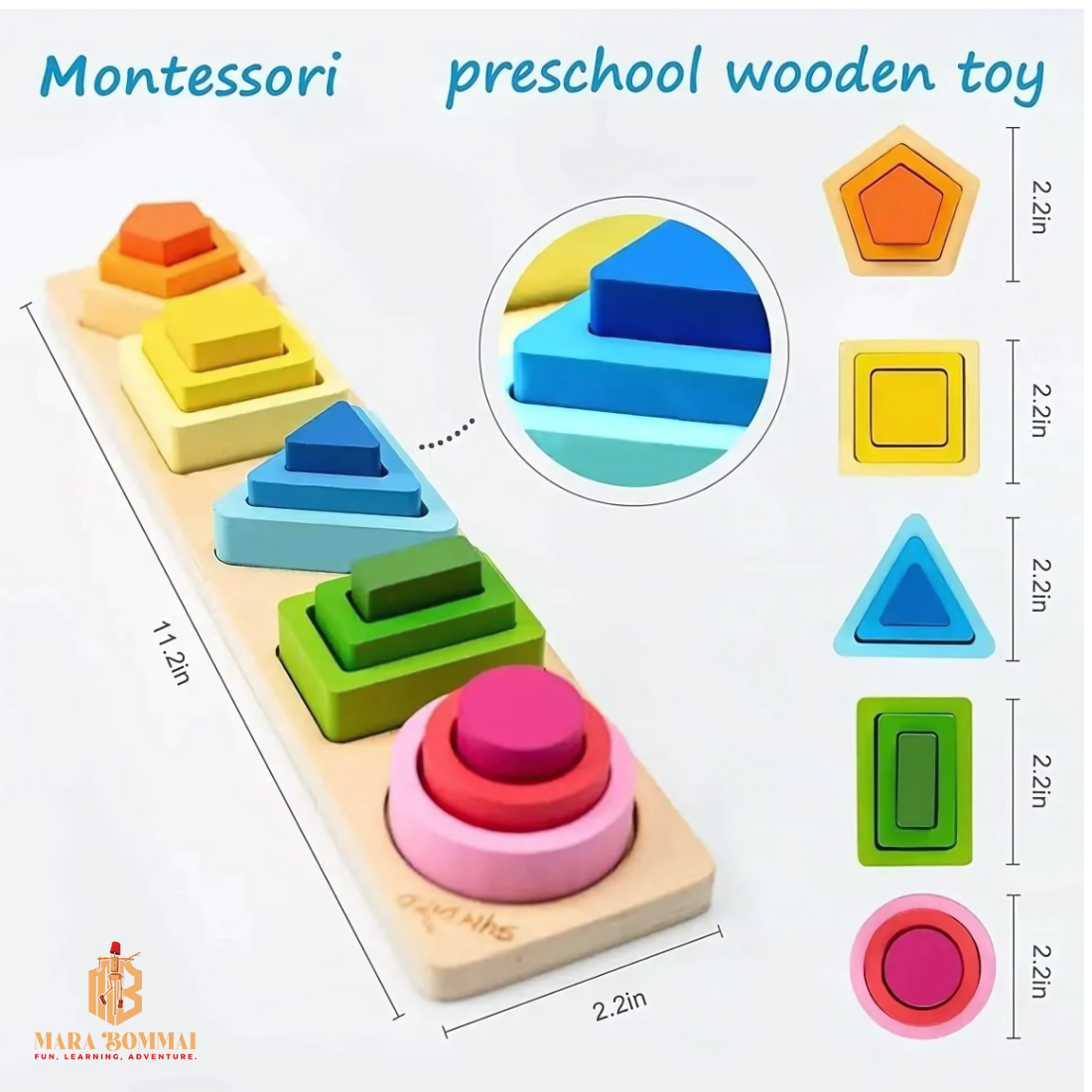 Be the first to review “MARA BOMMAIยฎ – Wooden Montessori Toys for Toddlers 1 2 3 Years โ€“ 5-in-1 Shape Sorter, Stacking Rings & Wooden Blocks | Educational Stacking Toys for Boys & Girls, Preschool Learning Gifts”